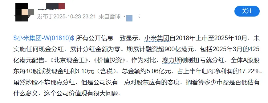 雪球上也有用户针对小米累计分红金额为零的情况表示,“虽然炒股不靠那点分红,但是公司没有一点对股东应有的态度。”