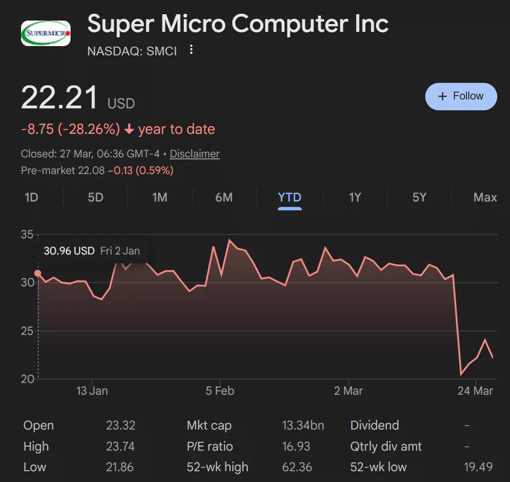 对于Supermicro而言,这次曝光来得十分不合时宜。一方面,该公司股价今年以来已累计下跌近三成,市场信心本就承压。另一方面,美国司法部上周解封了一份起诉书,指控Supermicro联合创始人廖义贤(英文名Wally Liaw)及另外两人合谋把美国高性能AI服务器非法转运至中国。